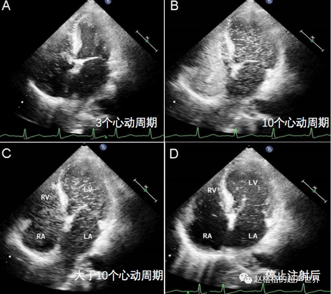 图A:在右心房和心室出现后,左心房中出现大量微气泡的延迟出现大于三个心动周期,这提示了肺动静脉瘘。