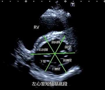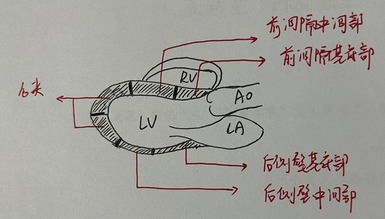 在短轴切面上,将基底环和中间环分为六个区域(每个区域占左心室周长的60°),将心尖环水平分为四个区域(每个区域占该水平的左心车周长的90°),区域的分割开始于室间隔和石心室游离壁的前交界处并逆时针旋转,这样就形成了16个节段,分别为: