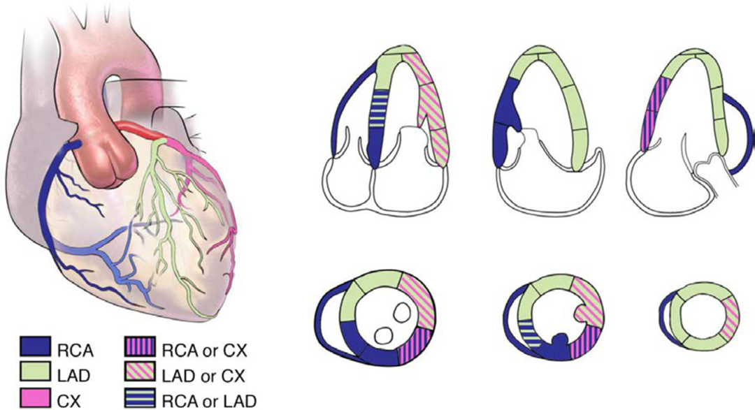 冠状动脉的分布分为右优势型、均衡型、左优势型。其分布因人而异,某些节段有冠状动脉供血重叠区,如心尖侧壁可由左前降支或左回旋支供血,心尖下壁可由左前降支或右冠状动脉供血。根据左室节段的运动情况,可以大致判断哪一段冠脉缺血。