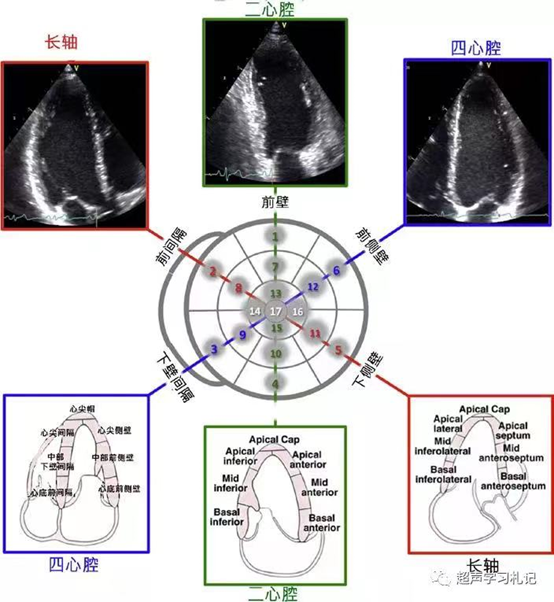 为能准确评估左心室节段性室壁运动异常,将左心室心肌分割成多个节段。目前最常用的左室心肌节段划分方法是ASE提出的16段模型法和17段模型法。