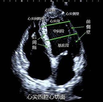 心尖四腔心观察左室基底及中间部下间隔、侧壁节段,心尖部间隔、侧壁节段