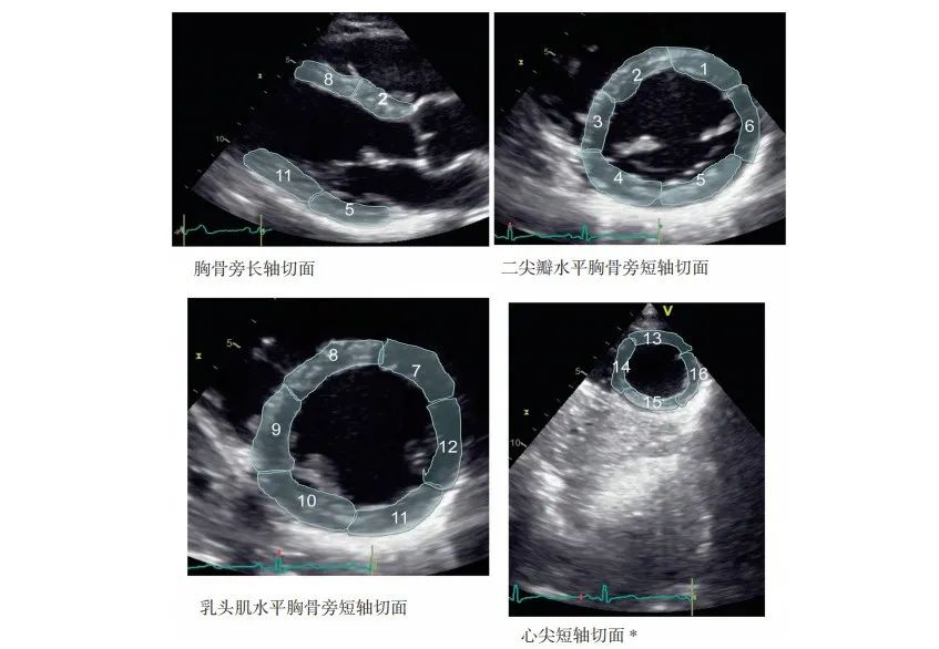 标准二维超声心动图观察左心室各心肌节段的定位,各个节段的数字对应前面的文字,心尖短轴切面通常从心尖处获得,移动探头让其高于传统四腔心切面一个肋间,并将探头向右肩倾斜,以获得右心室尖端消失处的环形切面