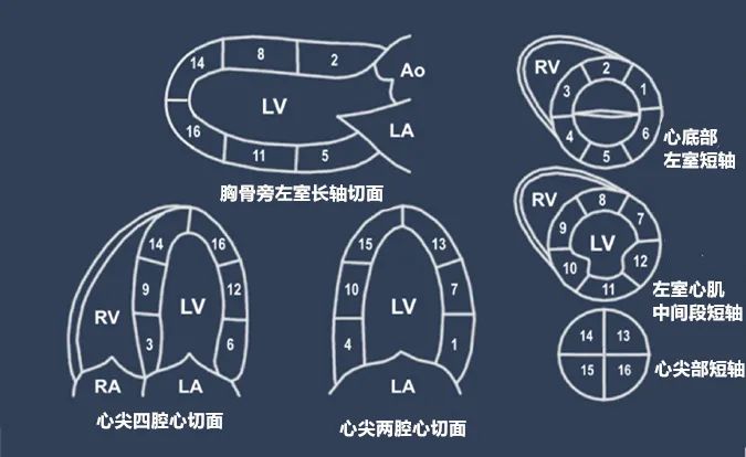 左室心肌16段模型示意图(各节段与上方文字对应)