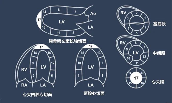 左室心肌17段模型示意图(各节段与上方文字对应)