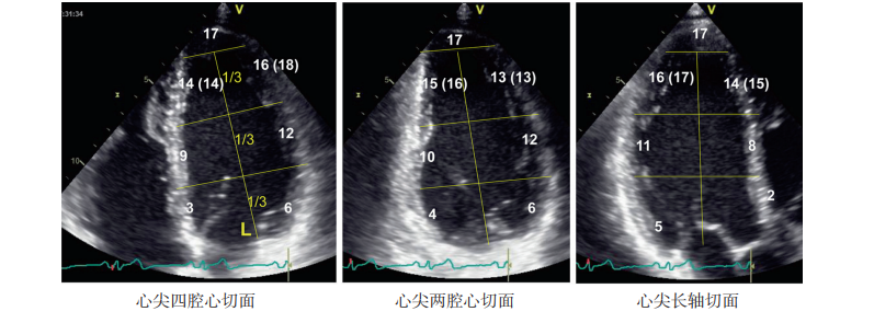 16段分段法是1989年由美国超声心动图学会(ASE)提出的,将左心室心肌分为三个心肌环,即基底环、中间环和心尖环,每个环的高度均是左室长度的1/3,其分界点为:二尖瓣瓣环水平至乳头肌尖端为基底环、从乳头肌尖端至乳头肌根部为中间环、乳头肌根部以下为心尖环。