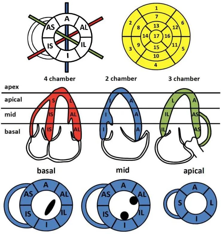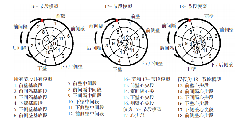 AHA提出的17段则是在16段的基础,将心尖部分为5个节段,即在前壁(13)、间隔心尖段(14)、下壁心尖端(15)、侧壁心尖段(16)及心尖帽(17)。心尖帽的定义是超出心腔末端的心肌部分。
