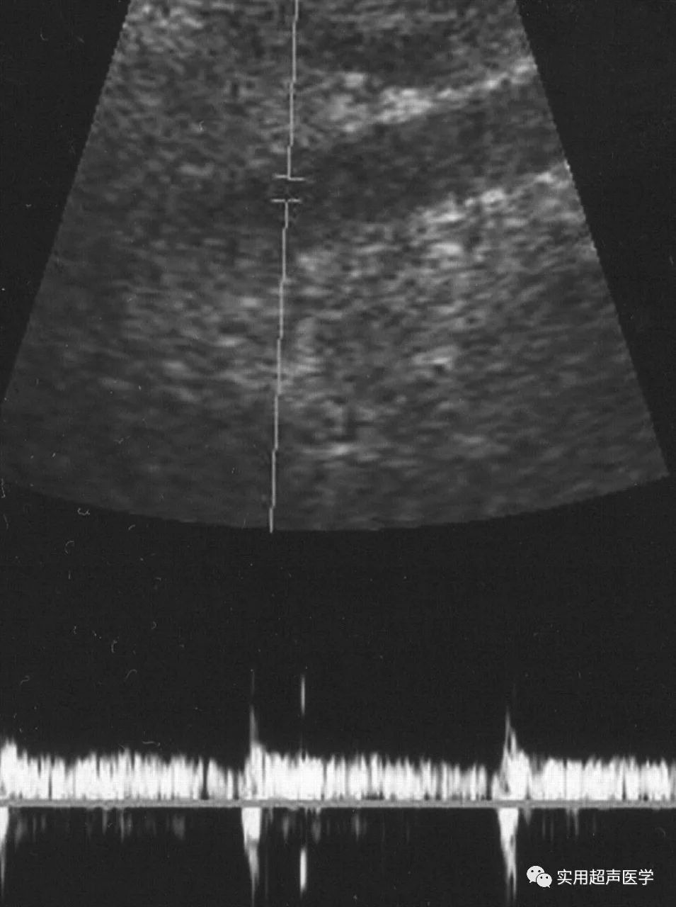 39岁盆腔充血综合征女性患者。扩张卵巢静脉丛的多普勒超声检查显示血流突然消失,与选择性卵巢静脉造影显示淤滞相关(未显示)。
