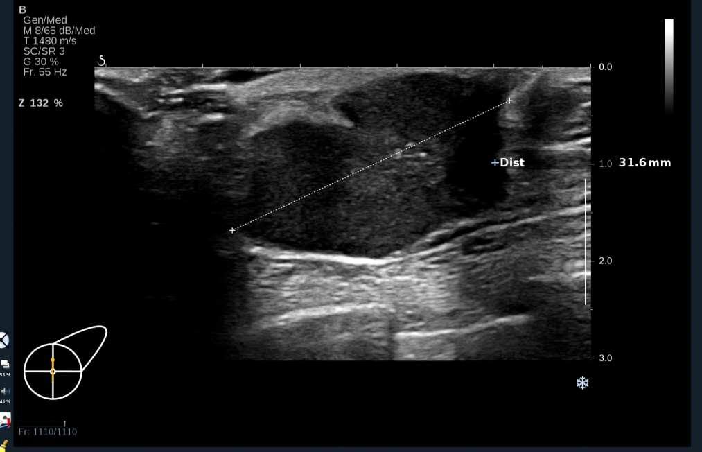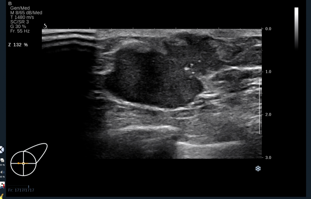 超声可见:左侧乳腺乳头后方可见少量腺体组织回声,其内可见一低回声团,大小约31.6×18.8×17.6mm,形态不规则,周边呈毛刺样,边界欠清,内回声不均匀,可见数个点状强回声。