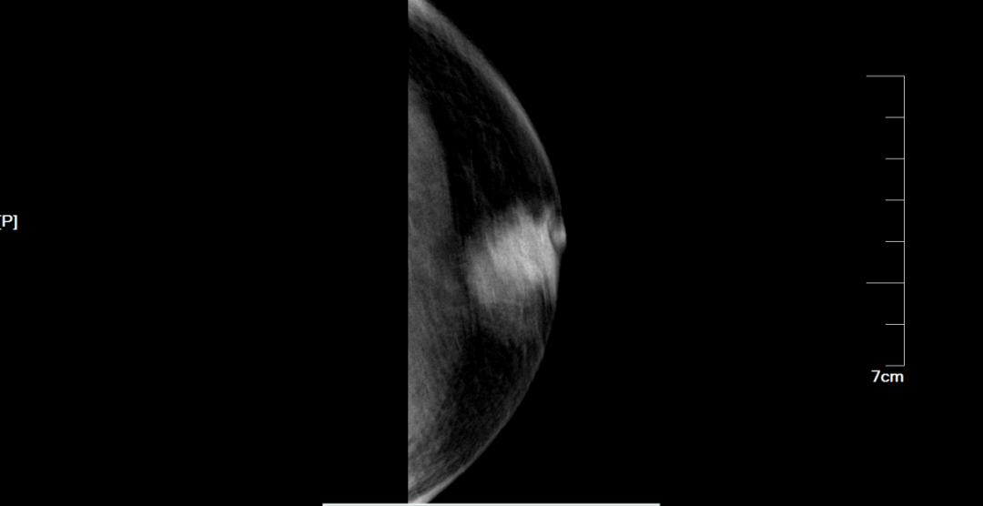 图5 左乳钼靶示左乳头后方不规则肿块影