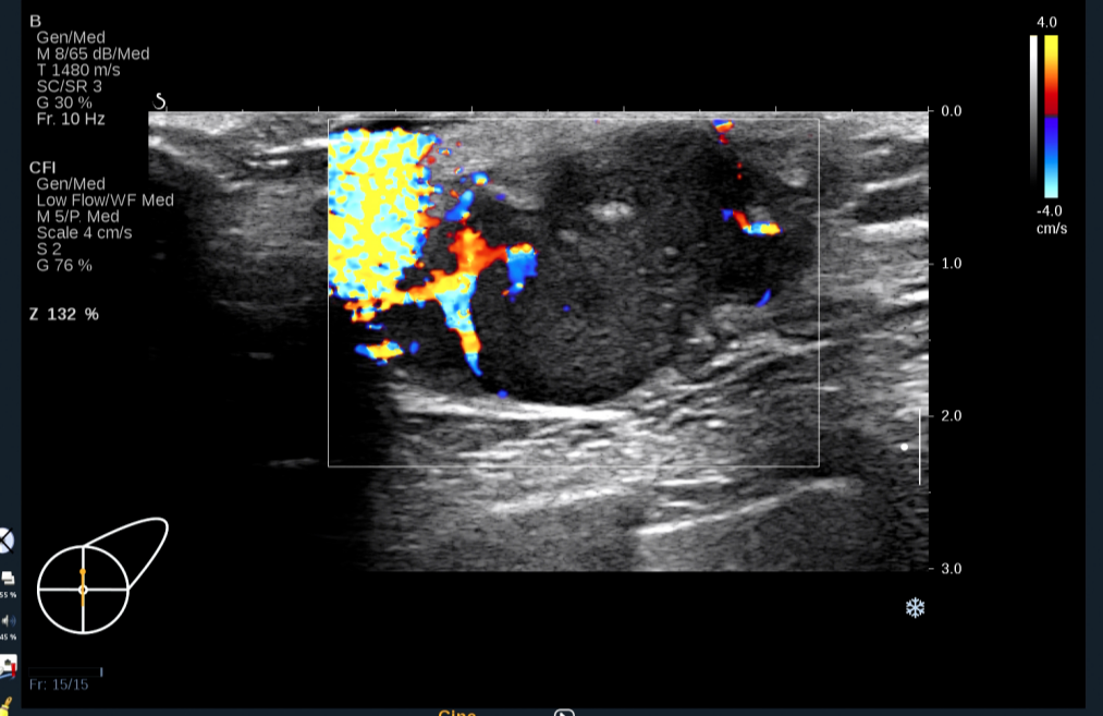 2、男性乳腺良性病变:良性病变多表现形态规则,边界清晰、整齐,有包膜,内部回声均匀,病灶内部血流信号不丰富,阻力指数低。