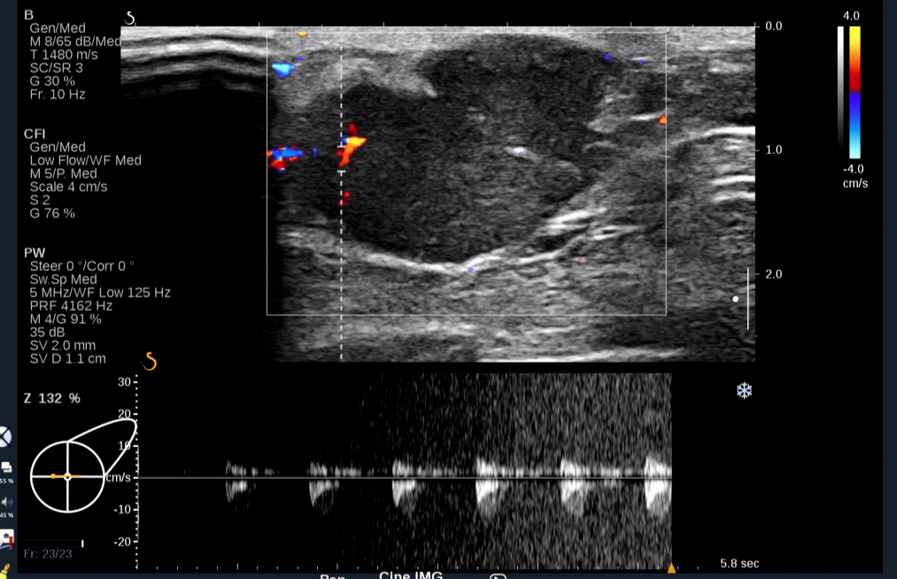 彩色多普勒及能量图:低回声团周边可见条形血流信号,并可测得动脉频谱,其内可见短棒状血流信号。