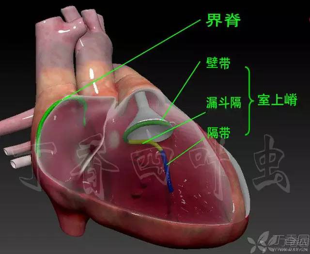 这两个结构就是室上嵴和界脊,说它们抽象因为在解剖上经常要把心脏切成两部分,如果一个结构跨越这两个位置或处于转折处作图表达起来就有困难,不多说,上图。