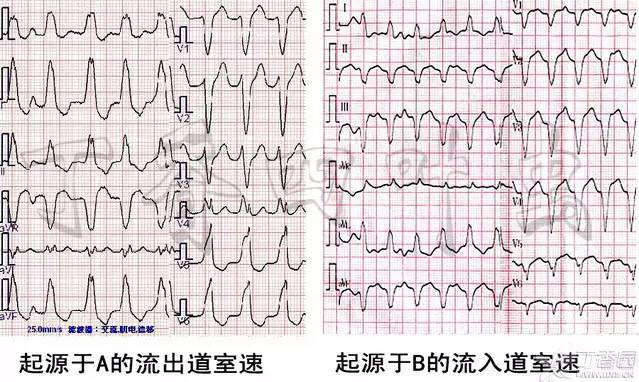 如果除极激动来自于窦房结或 A 点(流出道),那么除极大方向和 II、III、AVF 的大方向是一致的,所以在 II、III、AVF QRS 主波方向向上,如果来自于流入道 B 点,可想而知心脏除极由下向上,和 II、III、AVF 大方向相反所以在 II、III、AVF QRS 主波方向向下,那么它很可能是个起源于流入道的室早或室速。
