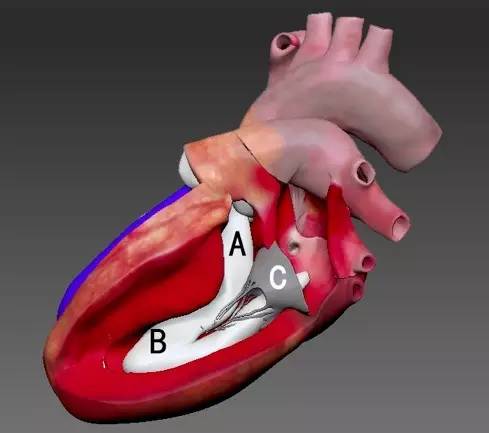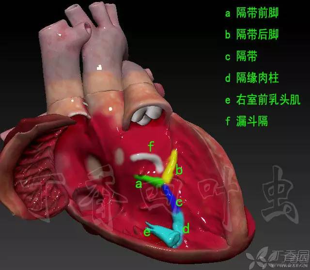 右心室有个 Y 字型扁平肌肉隆起非常醒目。这个「丫」分三个部分:c 为隔带,a 为隔带前脚,b 为隔带后脚,隔带向下延伸为隔缘肉柱,是心脏最大一个肉柱。我们所说的右束支就走在里面,隔缘肉柱的末端和前乳头肌连在一起。