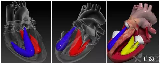下面,我们挖开左室,看一看他的内部结构,左室和右室一样有流入道和流出道。注意一点,二尖瓣前叶是左室流入道和流出道天然的分隔屏障,这个不必用过于复杂语言去描述,大家还是感性认识一下(图 1-28)。