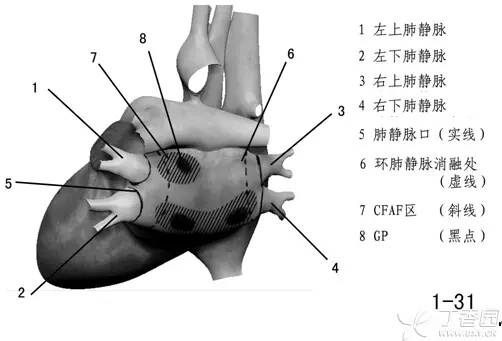 少数情况下作为旁观组织存在,如起源于上腔静脉的房颤,所以目前最常用的消融方式还是肺静脉消融,当然有时候 CFAE 区(心房复杂碎裂电位区)和 GP(神经节)也参与房颤形成,所以线性消融、肺静脉隔离术、腔静脉消融 成为环肺静脉消融的必要补充方式(图 1-31)。