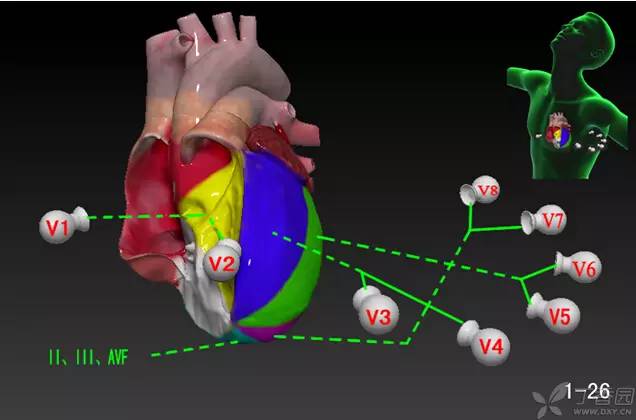 心电图上的缺血简要定位为 V1V2 间壁、V3V4 前壁、V5V6 侧壁、V7V8 后壁、II/III/AVF 下壁,这个心电图上的定位和解剖位置大体相当(图 1-26)。