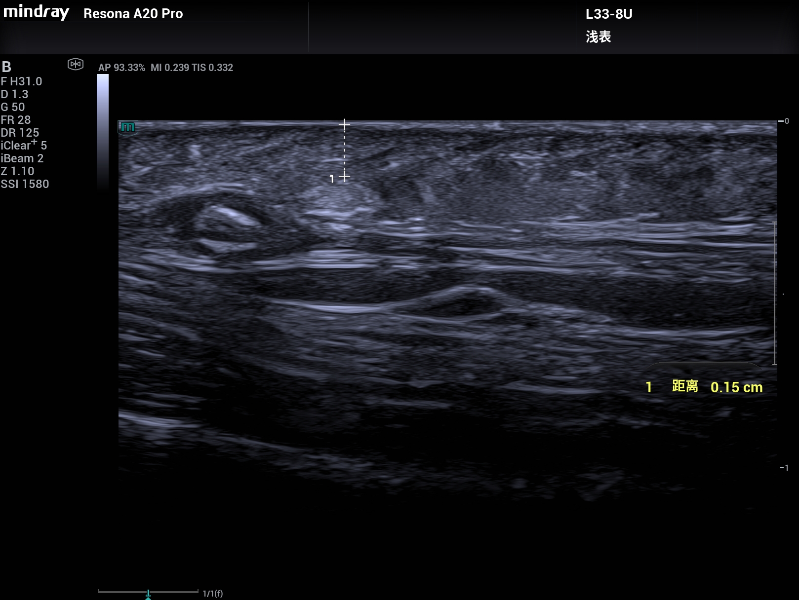 病例,33M和超微血流,头皮下1.5mm的2.6mm×1.1mm的脂肪瘤清楚显示,迈瑞Resona A20,2025年11月
