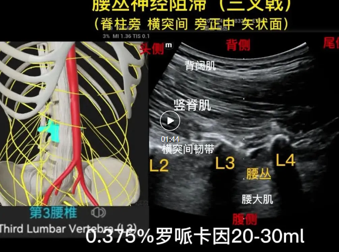 穿刺方法:平面内法,从人体背侧进针,探头柄部向腹侧稍倾斜,斜对穿刺针的方向。药物注射在L3-4横突之间腰大肌间隙(先找到L4的横突,然后稍向上平移到达L3-4横突的间隙)。一般为一个注射位点,即L3-4就可以。