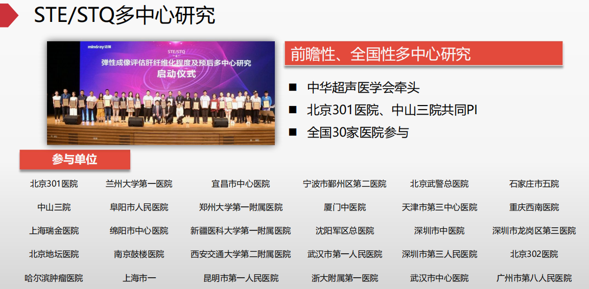 中华超声医学会牵头,北京301医院、中山三院共同PI单位,全国30家知名单位参加。2018年5月厦门启动,历时540余天。收集病例总数800多例,有效病例558例,创下了肝脏弹性多中心病例收集之最。2019年10月结项,形成“慢乙肝肝纤维化分期”迈瑞STE/STQ 的临床多中心的诊断参考标准。