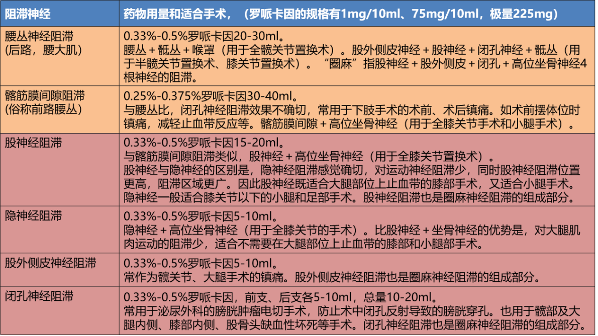 神经阻滞药物说明(下肢),药物用量和手术适应症对照表