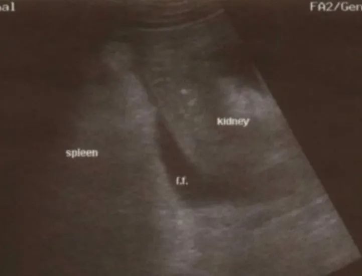 脾肾间隙和左肺底:像检查肝肾隐窝一样,将探头成角度地放置于患者的左上腹,但位置可能会更高(9~10肋)、更靠后,大约在腋后线的位置。脾可能比想象的位置更高、更靠后,比肝更难显示。对能够配合的患者,令其深呼吸,这样有利于获得清晰的图像。参照上述扫查方法,变化扫查角度,直到获得显示左肾、脾、膈肌和左肺底的清晰图像。游离积液显示为一黑色带样结构,位于脾肾间隙,或位于脾与膈肌之间(膈下游离积液)。