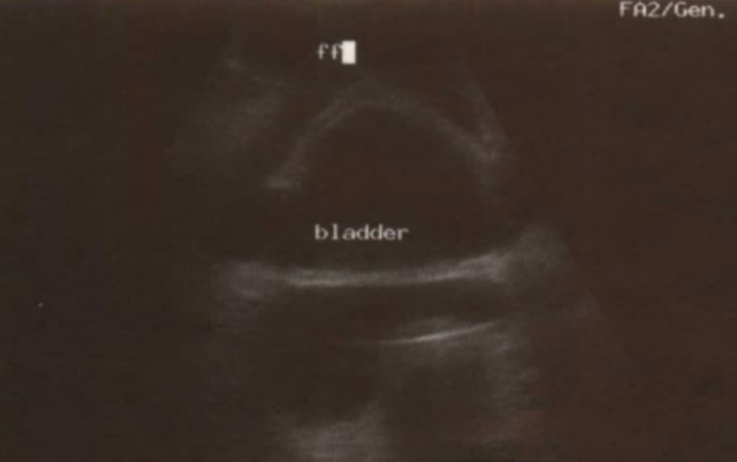 盆腔的矢状断面:盆腔的两个断面(矢状断面和横断面)都需要利用充盈的膀胱做声窗来显示盆腔组织结构。因此,超声探查盆腔时,膀胱充盈很重要。理想的扫查是在患者插入导尿管之前完成。否则,就要紧急钳夹导尿管,等待膀胱充盈,或通过导尿管将生理盐水注入膀胱使膀胱充盈。为获得盆腔矢状断面图,将探头置于耻骨联合上方的中线处,探头指向盆腔,与足侧腹壁成大约 45°角。这样的图像应显示膀胱的顶部和盆腔内部组织结构。游离积液将在膀胱周围或膀胱后方的道格拉斯陷窝。