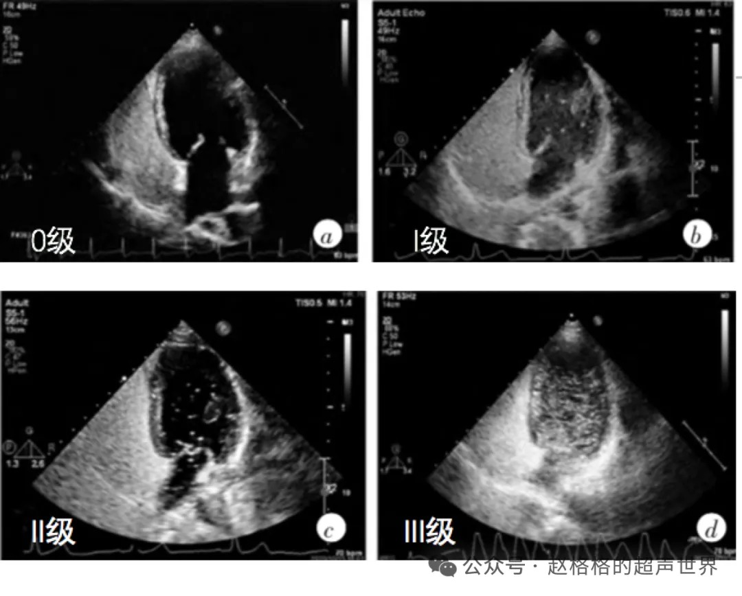I级:左心腔内 1~10 个微泡/帧,为少量 RLS;