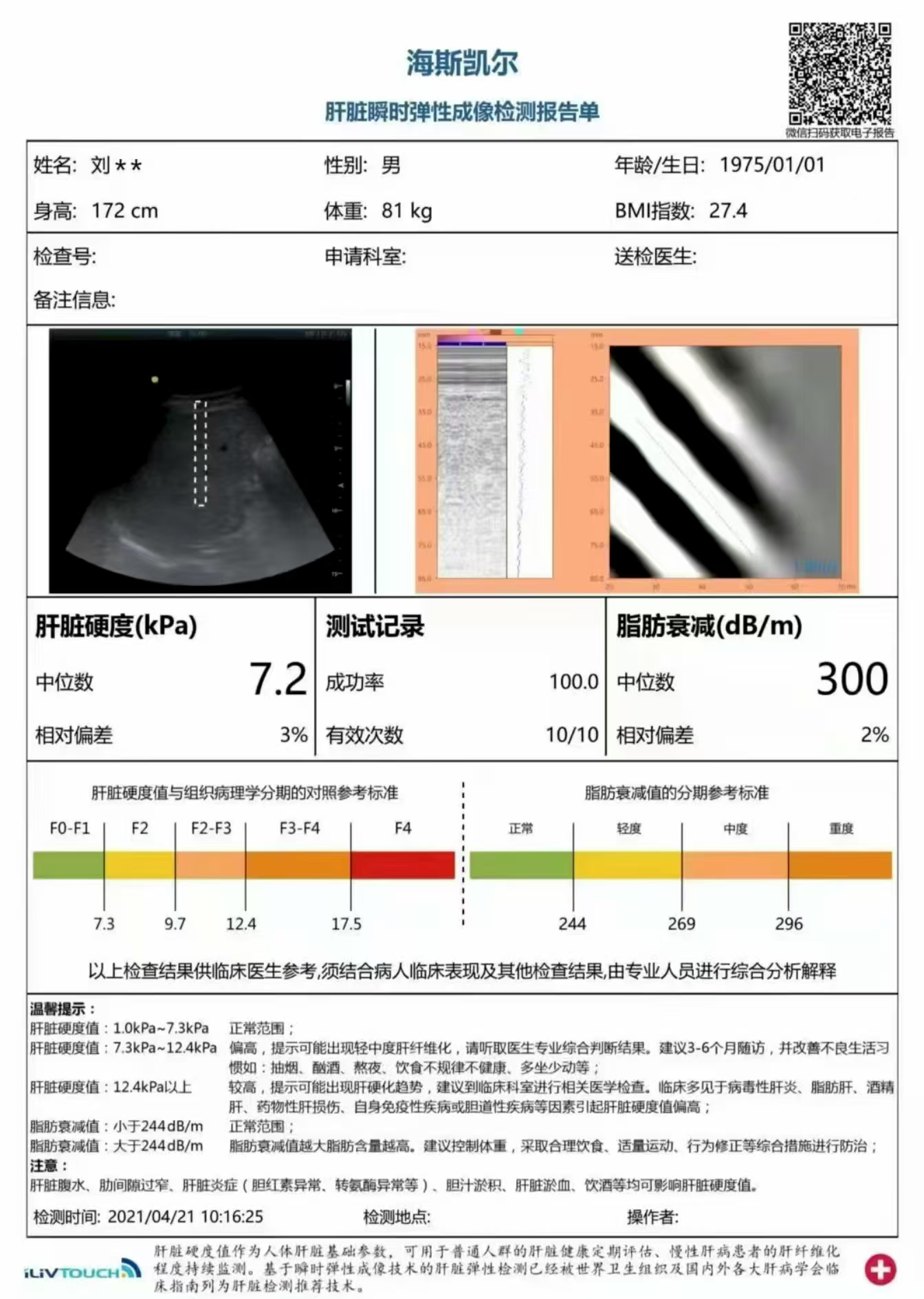 海斯凯尔展示机,肝脏超声影像和瞬时弹性成像检测报告单