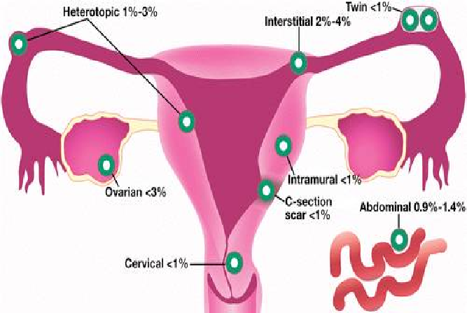 但约有7%的异位妊娠,不位于以上部位。这些少见的异位妊娠,包括:间质部妊娠、宫角妊娠、宫颈妊娠、剖宫产瘢痕妊娠、卵巢妊娠、腹腔妊娠等。
