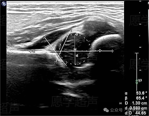 女性患儿,1月龄时因双下肢不等长,要求髋关节超声检查。查体:左下肢较右下肢短约2cm,左侧髋关节外展受限。超声图像髋臼略平直,股骨头与髋臼位置尚正常,盂唇位置偏高,骨性臼顶对股骨头的覆盖率减低,α角53.6°(<60°)、β角65.4°(>55°),骨性覆盖率44.65%。稳定试验时股骨头尚未脱出髋关节。如图: