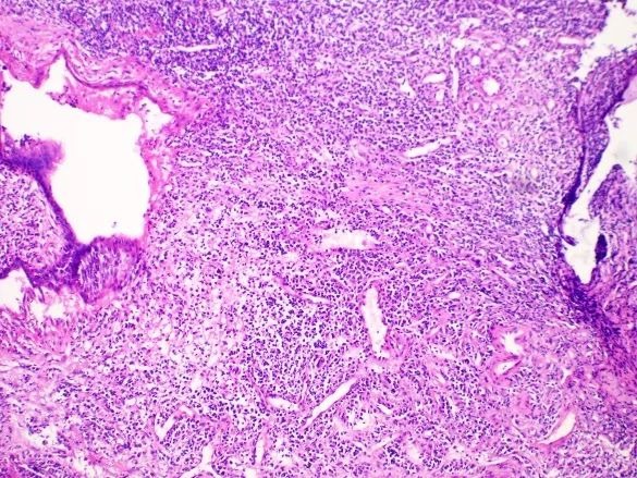 图 4 囊肿周边可见厚壁,类似「 面包圈 」征