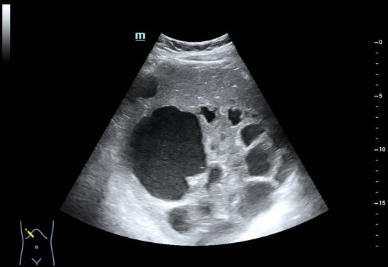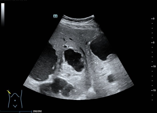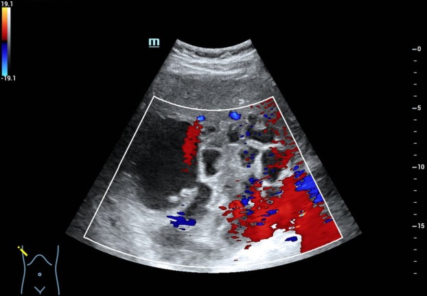 肝脏体积增大,右叶斜径约 19.0cm ,肝内可见多个厚壁无回声,大的位于肝右叶,大小约 15.5cmx13.9cm 的囊实性结节,内可见粗大分隔及壁结节,肝内胆管未见扩张。CDFI: 囊肿周边可见少许血流信号(图 1-5 )。