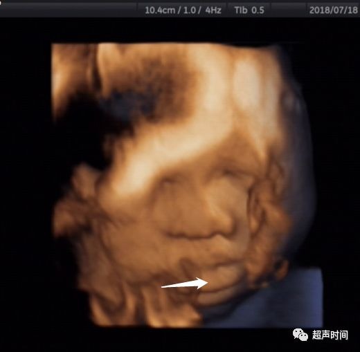 图 4 孕 36 周胎儿面部三维超声示胎儿舌部(箭头示)部分伸出口外
