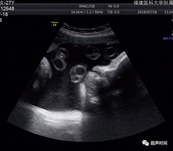 患者 27 岁,G2P1,孕 36 周来我院行产前常规检查。患者无特殊既往史,首产女婴体健。本次妊娠曾分别于孕 12 周和23 周在我院行产前超声检查,均未见明显异常(图 1 和图 2)。