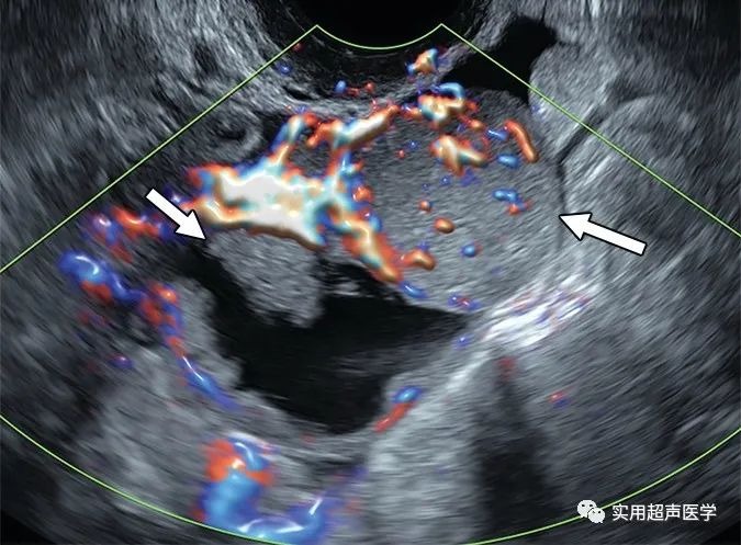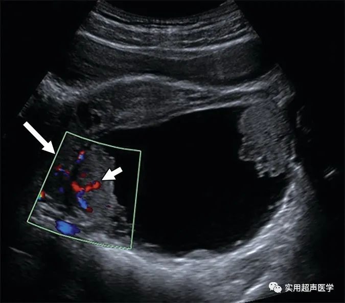 同一患者彩色多普勒超声图像的彩色框(大箭头)显示确认实体组织的血流(小箭头)。浆液界性肿瘤在胎龄18周时切除。