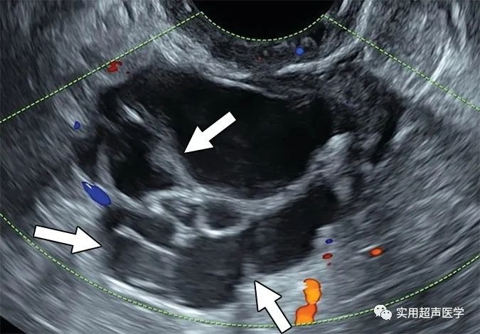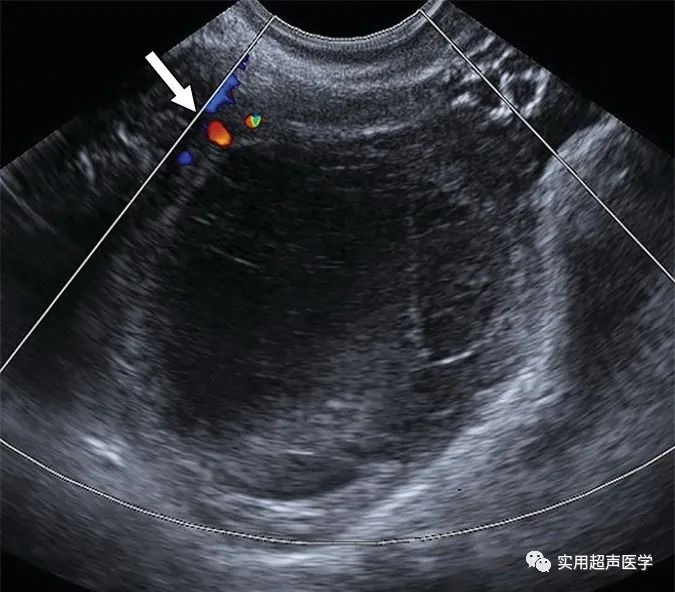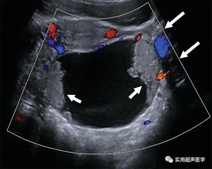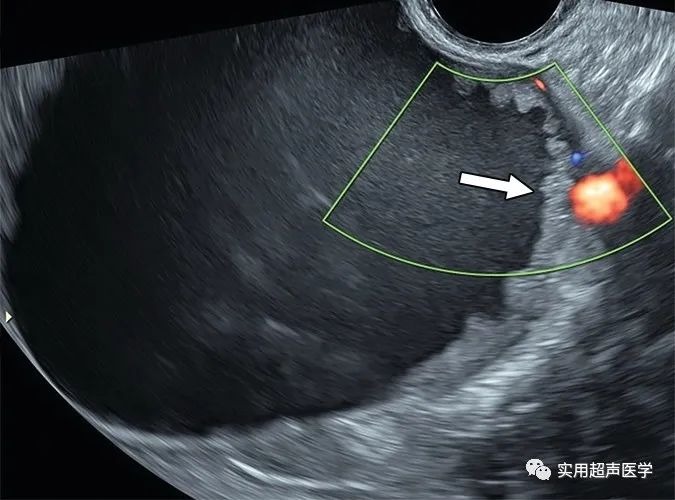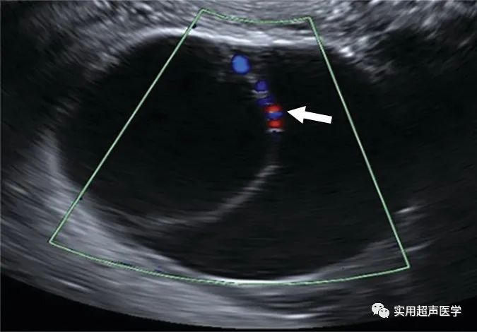 28岁女性,因出血性囊肿而疼痛。彩色多普勒超声图像显示卵巢实质周围血流(箭头),可确保进行充分的色流评估,增加诊断信心。当进行彩色多普勒成像时,必须在盒子内可视化一些颜色,以确保进行充分的技术评估。