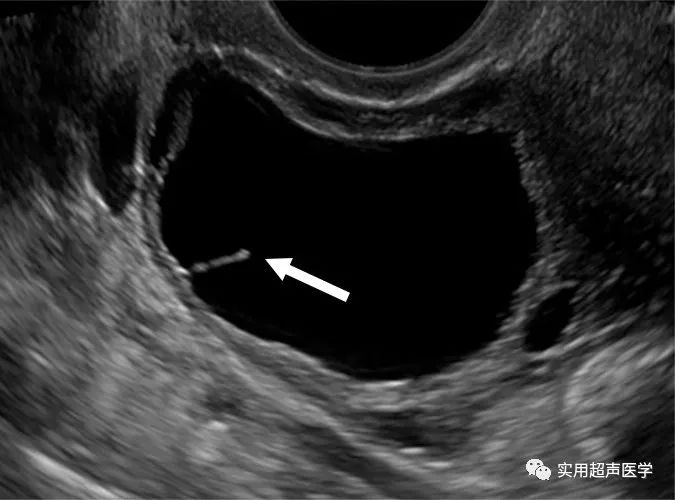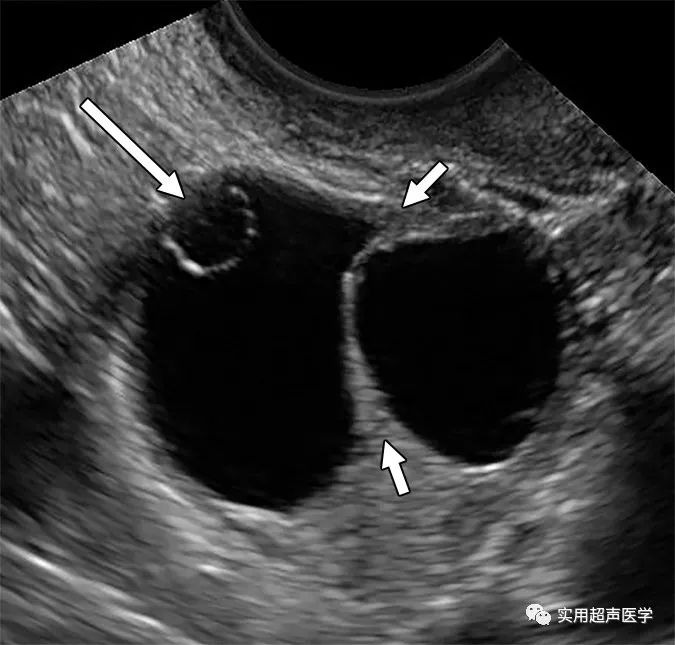 22岁女性,伴有继发性闭经。超声图像显示囊肿内囊肿外观或子囊肿(长箭头),代表相邻卵巢实质内单独卵泡的部分体积平均。发现不应与多房囊肿混淆。将两个相邻的卵泡或囊肿与单个纵隔囊肿区分开来也可能具有挑战性。可疑隔膜两侧的卵巢组织(小箭头)达到峰值(八字形征)可确认邻近卵泡并排除真正的纵隔囊肿。