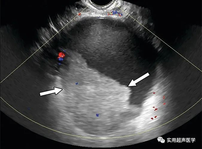 区分固体和囊性物质可能存在问题。彩色多普勒血流的存在可确认实体组织,而无血流可能代表碎屑或坏死组织,且帮助较小。区分固体材料和碎屑的另一个技巧是对相关区域施加温和的传感器压力,随后的内部运动(“抖动”征)提示碎片,例如血凝块。如有疑问,应将病变分类为实性病变。