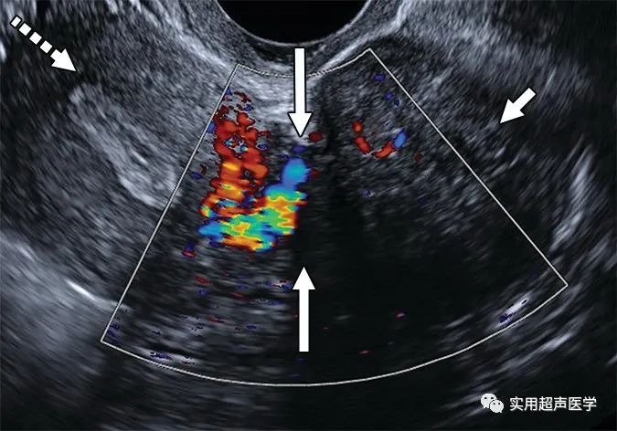 36 岁女性,彩色多普勒超声图像显示子宫(虚线箭头)和实心病变(短实心箭头)之间的桥接血管(长实心箭头),证实外生性浆膜下平滑肌瘤,而不是卵巢病变。由于最常见的附件实性肿块是外生性肌瘤,因此当未看到单独的卵巢且怀疑卵巢病因时,谨慎的做法是寻找与子宫的联系。