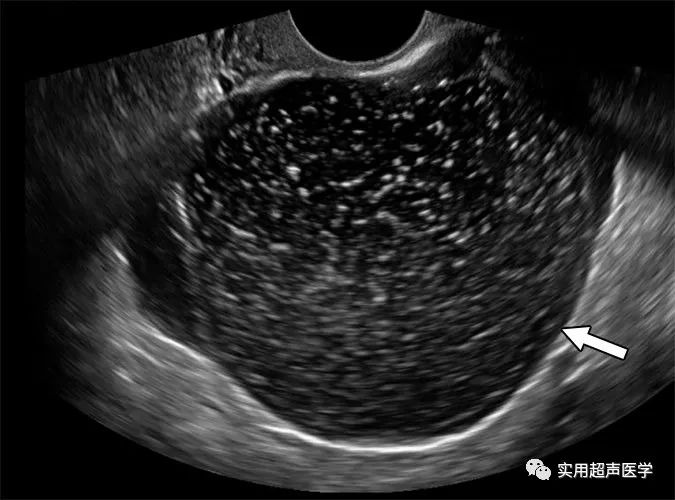 56岁女性,伴有隐性腹痛和边缘浆液性肿瘤。超声图像显示 10.5 cm 右侧卵巢单房囊性病变,伴有与 O-RADS 3 病变一致的散射内部回声(箭头)。