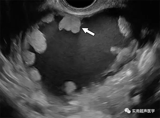 35岁女性,右下腹胀满,边缘性浆液性囊腺瘤。超声图像显示单房囊肿,有多个状突起(箭头)。评估是卵巢-附件报告和数据系统 (O-RADS) 类别 5。状突起代表突出到囊肿腔的固体成分的亚型,高度至少为 3 mm,三面被液体包围。状投影在其与附着的壁或隔膜的界面处具有锐角,而固体成分呈钝角并呈现无柄。状投影的数量有助于O-RADS风险类别评估,四个或更多状投影赋予更高的恶性肿瘤风险。