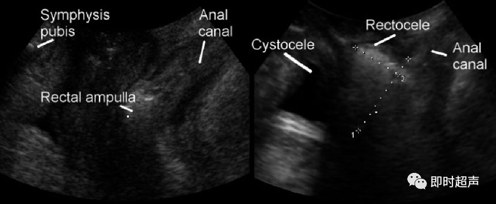 会阴体组织缺陷导致的会阴体下降,超声表现为直肠壶腹部位于耻骨联合后下缘水平线下方,与该参考线的垂直距离≥15mm,肛门内括约肌回声连续。膨出物与肛管间夹角呈钝角。