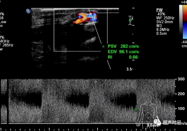 图 3 造瘘后流入动脉频谱。 流入动脉流速增高、阻力减低
