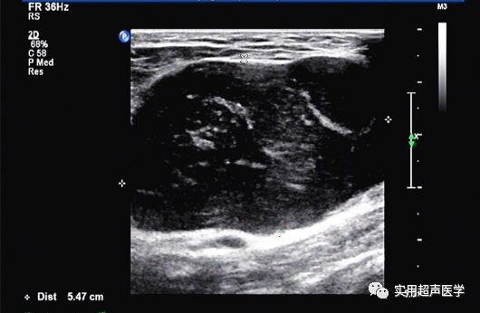 4、淋巴结转移癌 因乳腺癌、鼻咽癌、口腔癌等器官原发病灶通过淋巴管引流发生,超声表现为单个或多个低回声聚集,多呈圆形,钙化少见,CDFI示血流信号丰富,根据病史并搜索原发灶可予鉴别。
