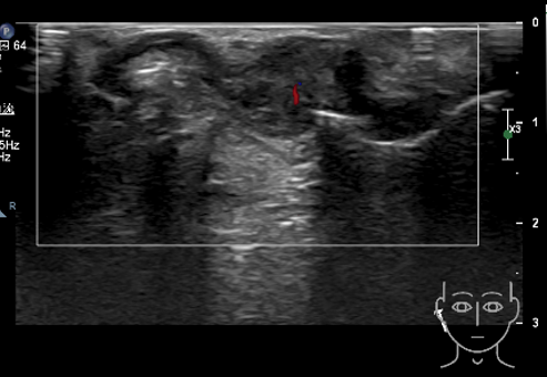 右耳软骨前后部见一低回声团,范围 3.9cm×1.9cm ,边界欠清,形态不规则,内回声不均,可见少许血流信号(见图 2-3 )。