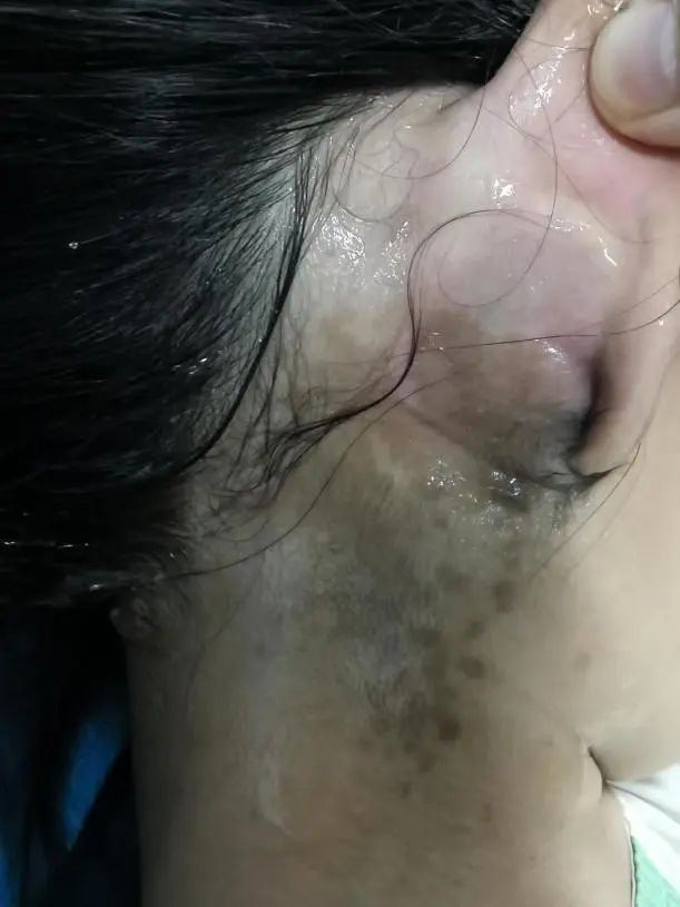 图 1 患者耳后外观图「 牛奶咖啡斑」