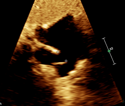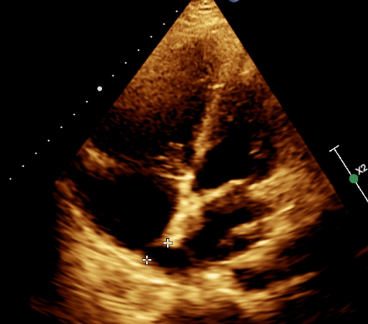 图 1 四腔心切面显示房间隔上可探及宽约 13mm 回声失落,房顶部未见明显