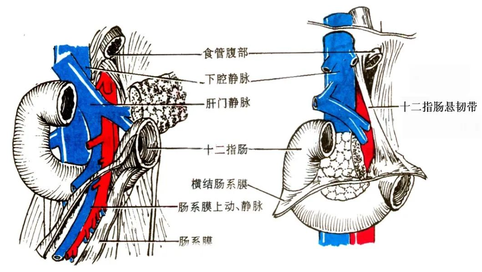 肠系膜上动、静脉从胰体下缘潜出后,紧贴水平部的前面下行。起于腹主动脉的肠系膜上动脉与腹主动脉之间形成尖朝上的夹角,十二指肠水平部远侧段恰穿过该三角区。