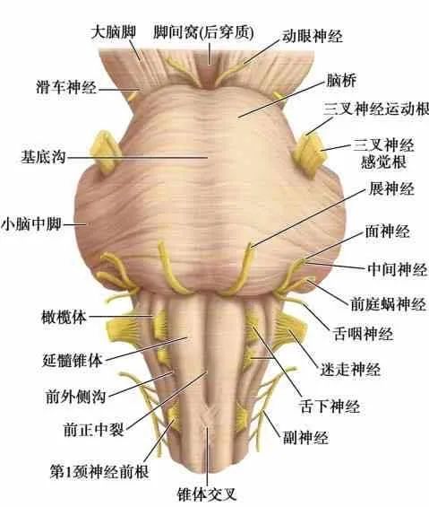 脑桥的腹侧部膨隆,称脑桥基底部,中线上有一浅沟,称为基底沟。基底沟容纳基底动脉。脑桥基底部向两侧逐渐缩窄,称为脑桥臂(小脑中脚),借此与小脑相连